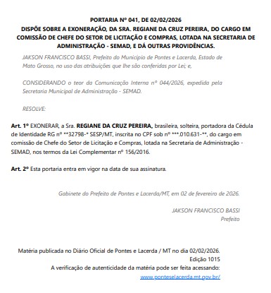 Ainda na segunda-feira (2), foi publicada a portaria assinada pelo prefeito determinando a exoneração de Regiane da Cruz Pereira, que ocupava o cargo comissionado de chefe do setor de Licitação e Compras, área diretamente ligada aos processos administrativos questionados na denúncia apresentada ao Legislativo.